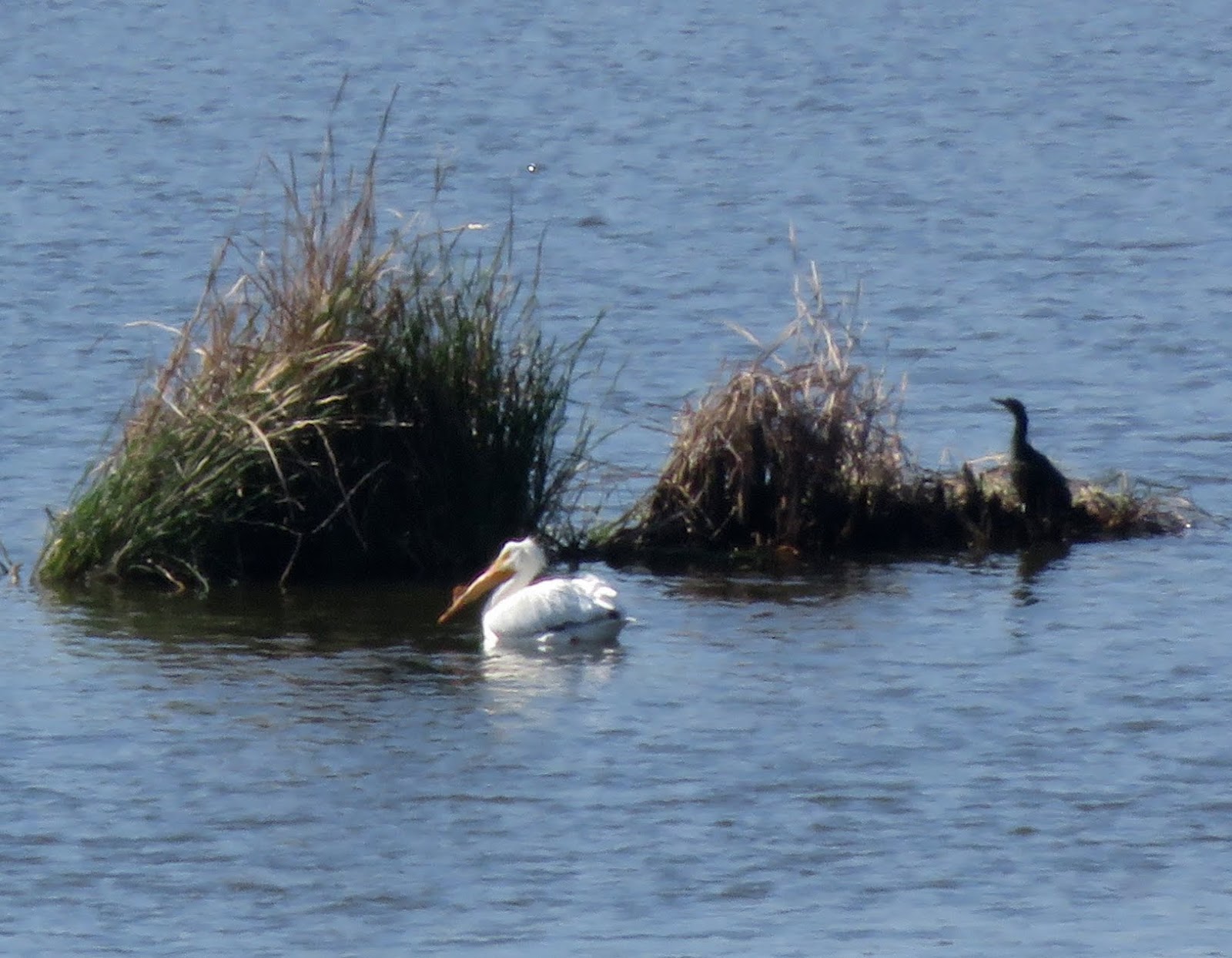 There were still quite a few American White Pelicans at the lagoon. They are entering the breeding season and have grown horns on their bills. Below is a photo of one of the pelicans with a horn, as well as a Double-crested Cormorant.