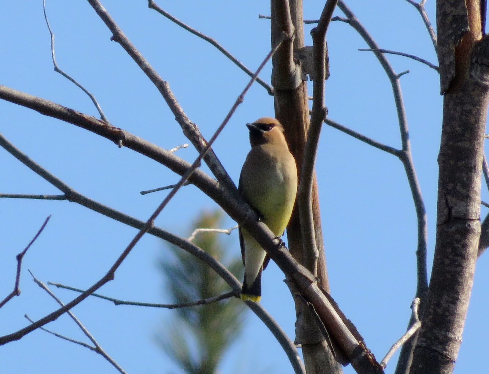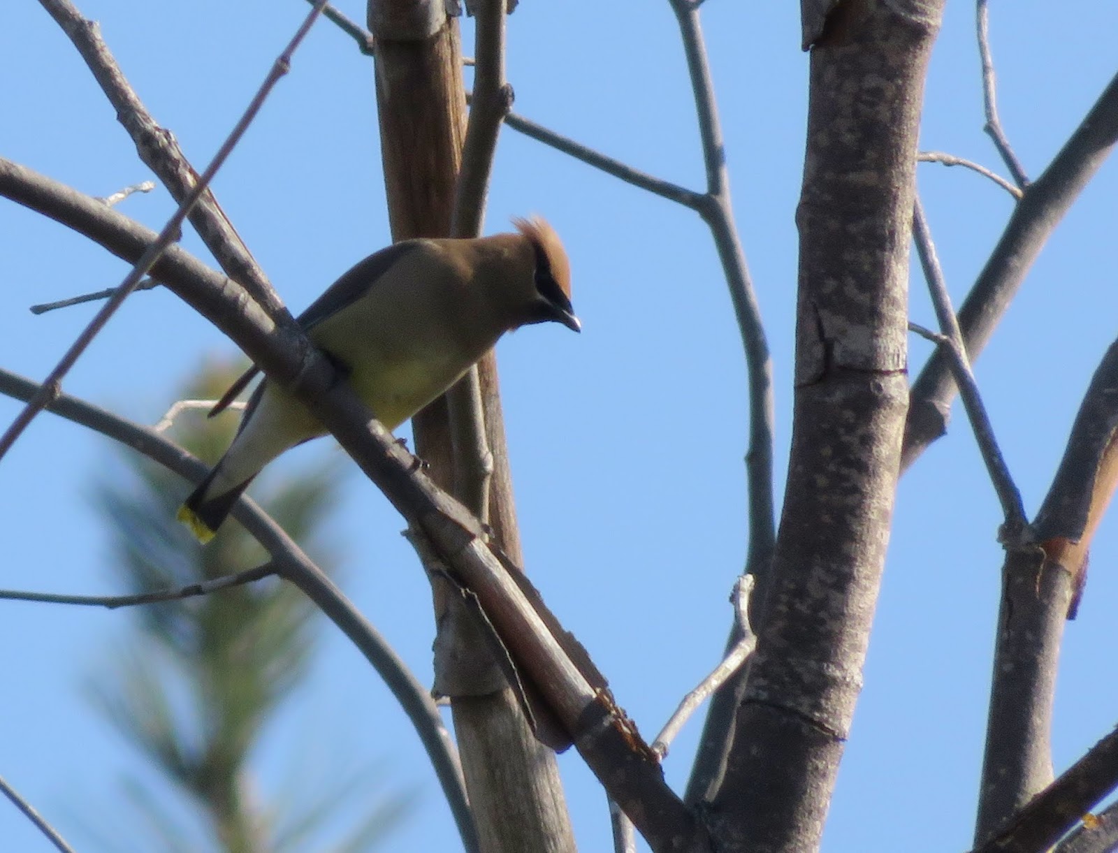 The orioles have started to arrive, though many of the winter birds are still here (though they'll probably start leaving sometime soon). We saw large flocks of Cedar Waxwings throughout the day. They were singing loudly, and some were acting like flycatchers - flying out, hovering a little, then returning to their perch. We also saw a few Hooded Orioles; two pairs. Below are three photos of Cedar Waxwings, and two photos of a couple of male Hooded Orioles.