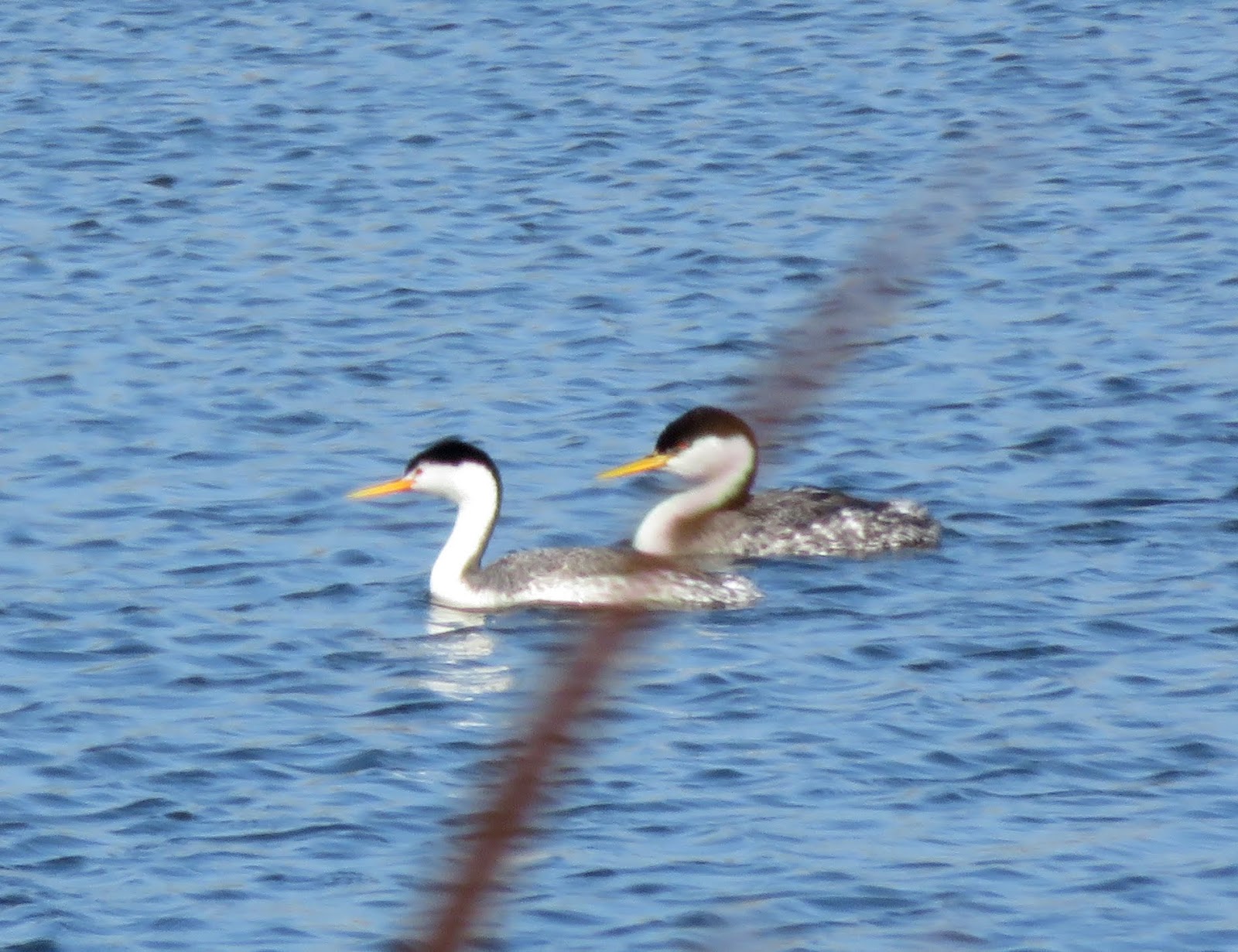 We saw several Western Grebes and one Clark's Grebe. The Clark's was swimming right alongside a Western, giving us a great view of the two species. Below is a photo of them. The Clark's is in front (white above the eye) and the Western is in back (black covering the eye).