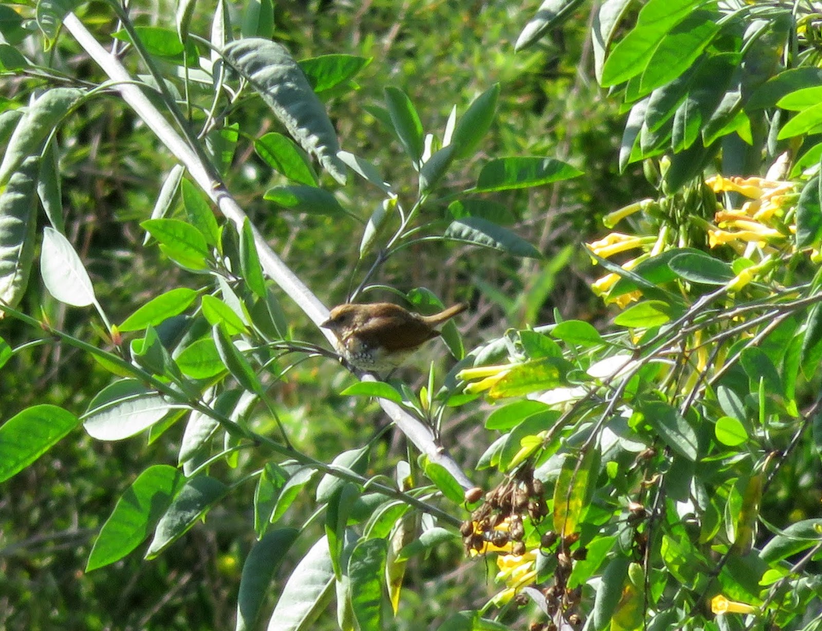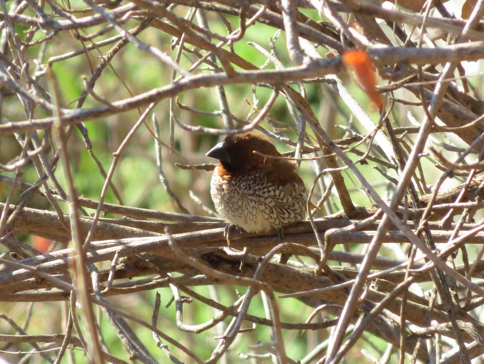 There is another pet store bird (like the Orange Bishop I mentioned in the last post) that has been spreading, and has established itself in California. It is the Scaly-breasted Munia, also call the Spotted Munia, Nutmeg Mannikin, and Spice Finch. The male has a dark brown back, darker face, and a scaled chest. The female looks very much like a muted version of the male. We saw them at the lagoon a couple of months ago, and saw them again this time. Below are two photos. The first is of a male at the lagoon. The second is a photo I took of one in San Luis Obispo that better shows the markings.