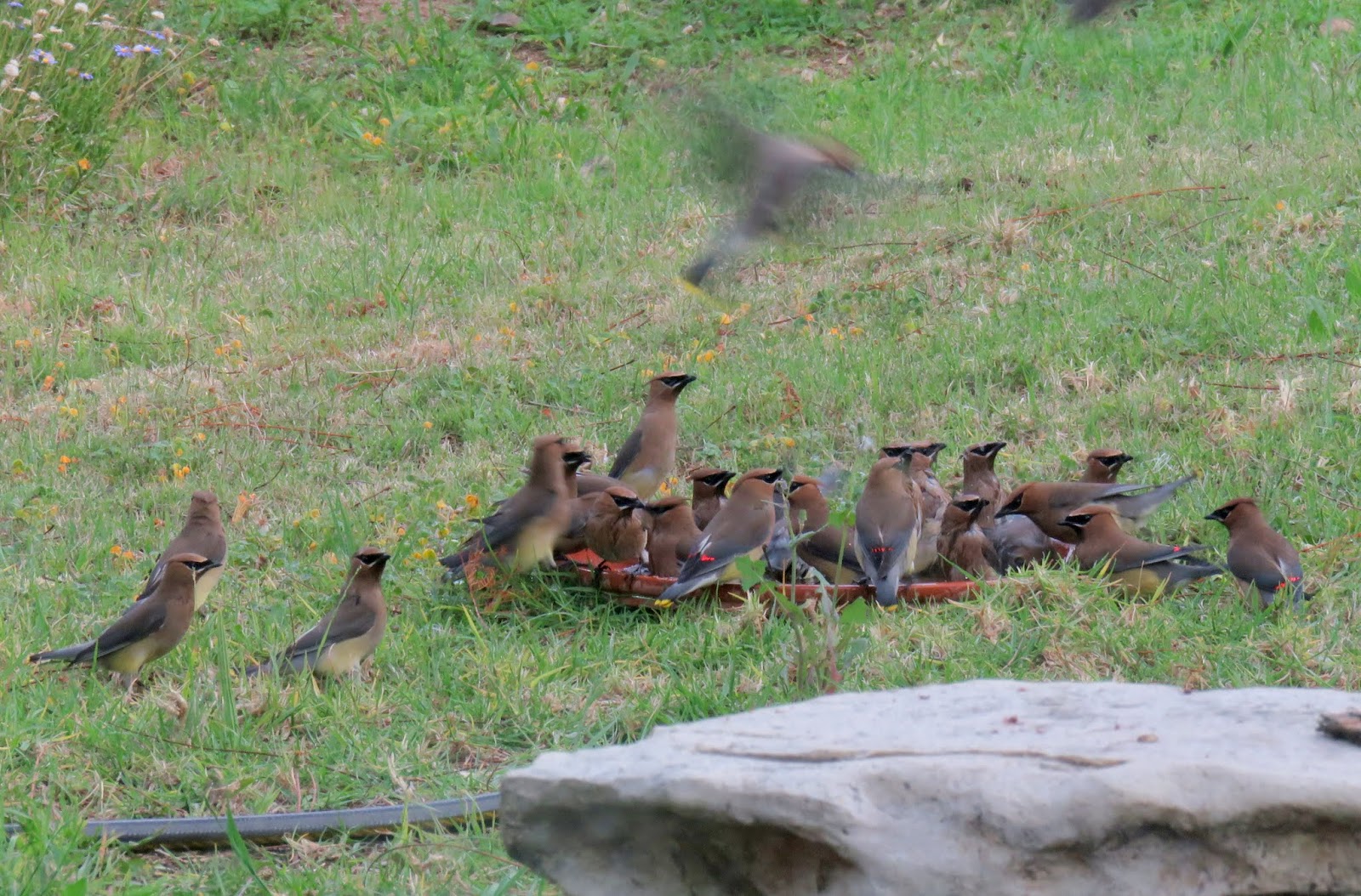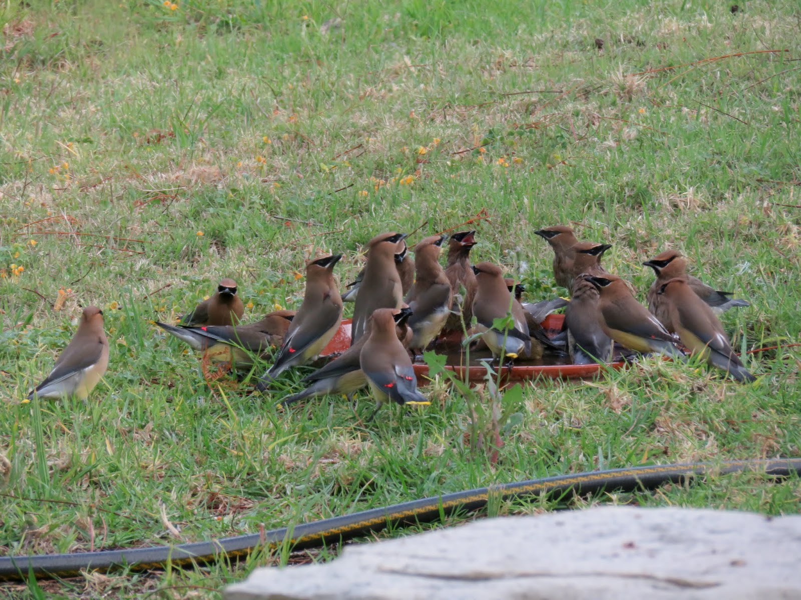 Bonus: A large group of Cedar Waxwings came down to take baths and drink in my yard yesterday. They were all crowding each other and being very noisy, all trying to bathe and drink at the same time out of one small clay bowl. More birds were constantly joining or flying off. It was very chaotic. Below are two photos of some of the waxwings.