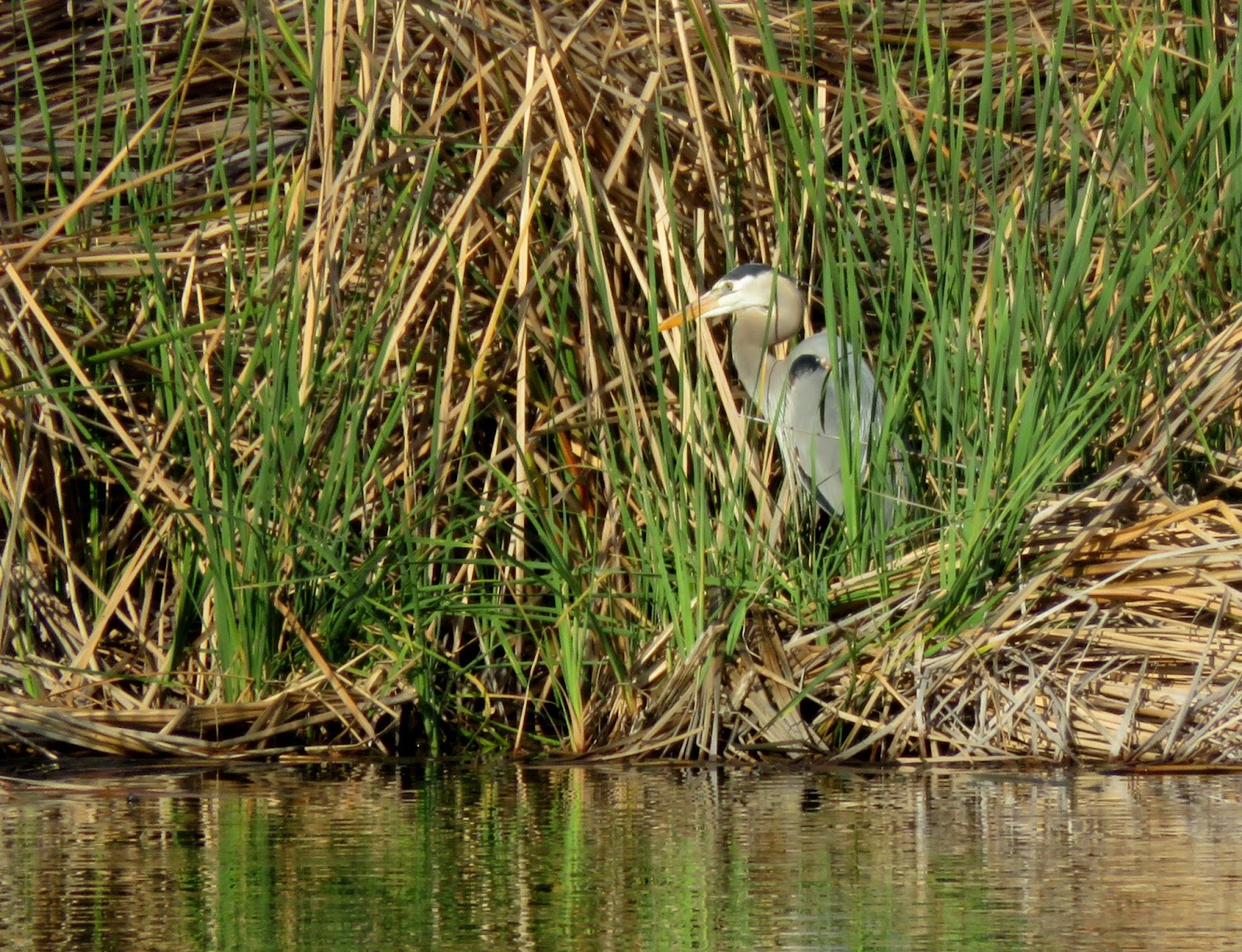 We didn't see very many members of the heron and egret family, but we did see a couple of Great Blue Herons. Below is one of them, sitting at the edge of the reeds.