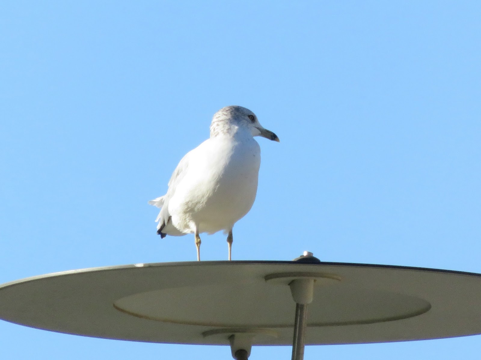 There are also quite a few gulls at school, mainly Ring-billed Gulls. There's a baby Ring-billed Gull living on top of the rec center at the moment; though, unfortunately, I haven't been able to photograph it (it stays hidden, though I often hear it). Below is a photo of an adult Ring-billed Gull in nonbreeding plumage (notice the speckles on the back of its head).