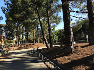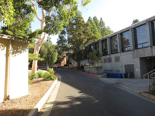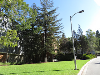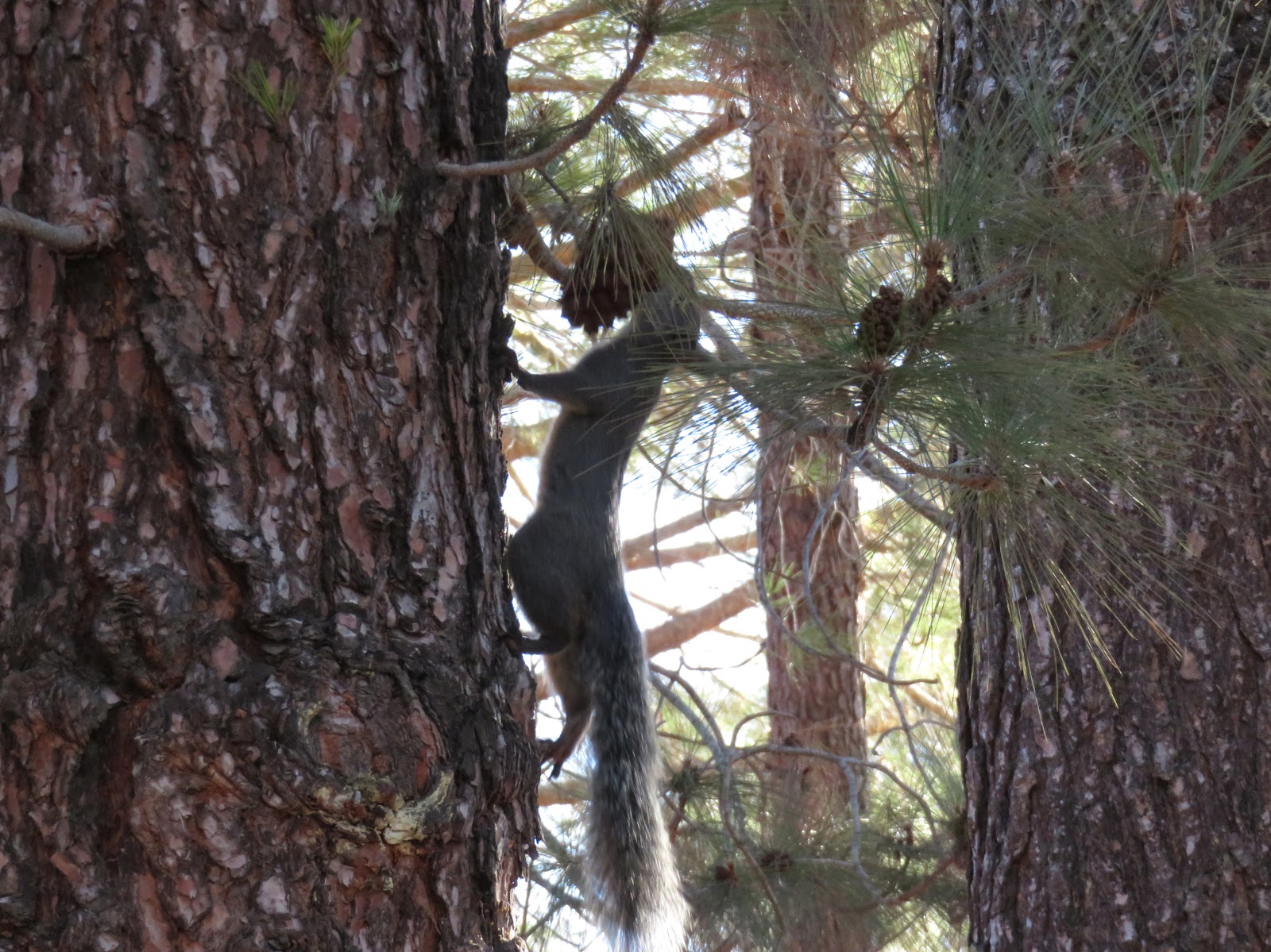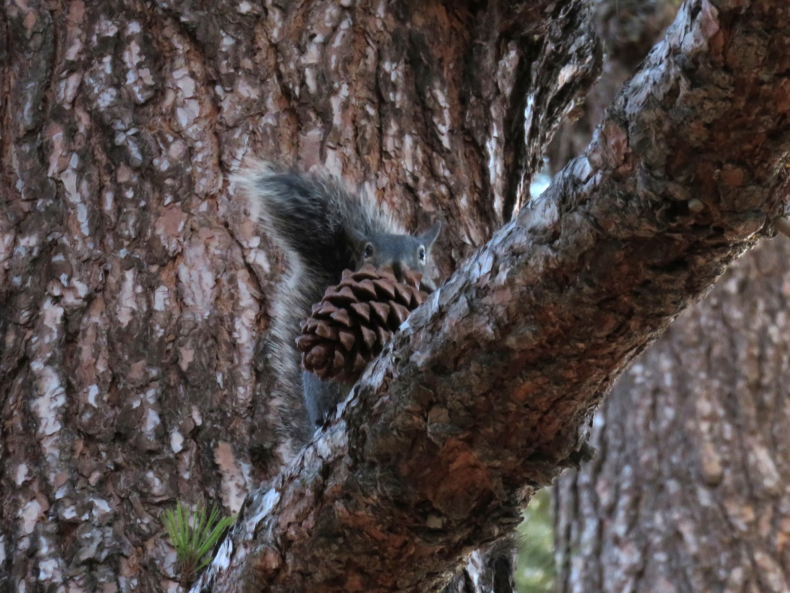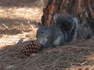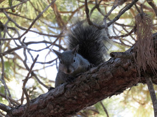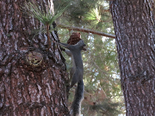 The entire time I've been here, I've been expecting to see Western Gray Squirrels. However, until today, I hadn't seen a single one. I was starting to worry that they weren't here anymore (as I've mentioned before, Western Gray Squirrels are disappearing in parts of their range due to disease, habitat loss, and competition with the invasive Eastern Fox Squirrel). This morning, though, I saw them everywhere. They were very noisy and energetic, running all over the place and barking in the trees. I was very impressed with one of the squirrels, a somewhat small female. She managed to pick up a large pinecone in her mouth and carry it all the way up a tree without dropping it. Below are five photos of that particular Western Gray Squirrel. (Note: Oddly, all of the squirrels seemed to just disappear a bit before ten o'clock. If you want to see them, you have to get up early.)