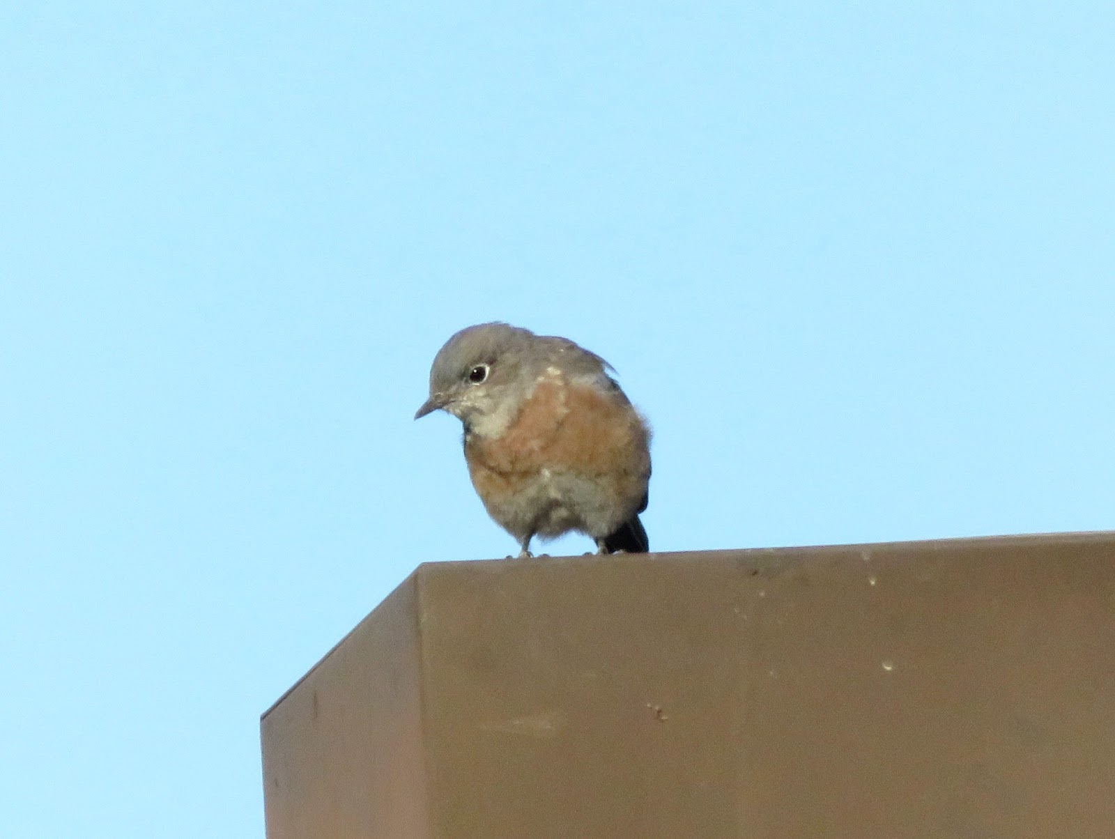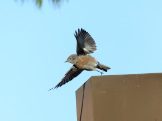 There are a lot of Western Bluebirds at Cal Poly. I see them every morning catching bugs on the lawns. Below are two photos of a female bluebird I saw this morning.