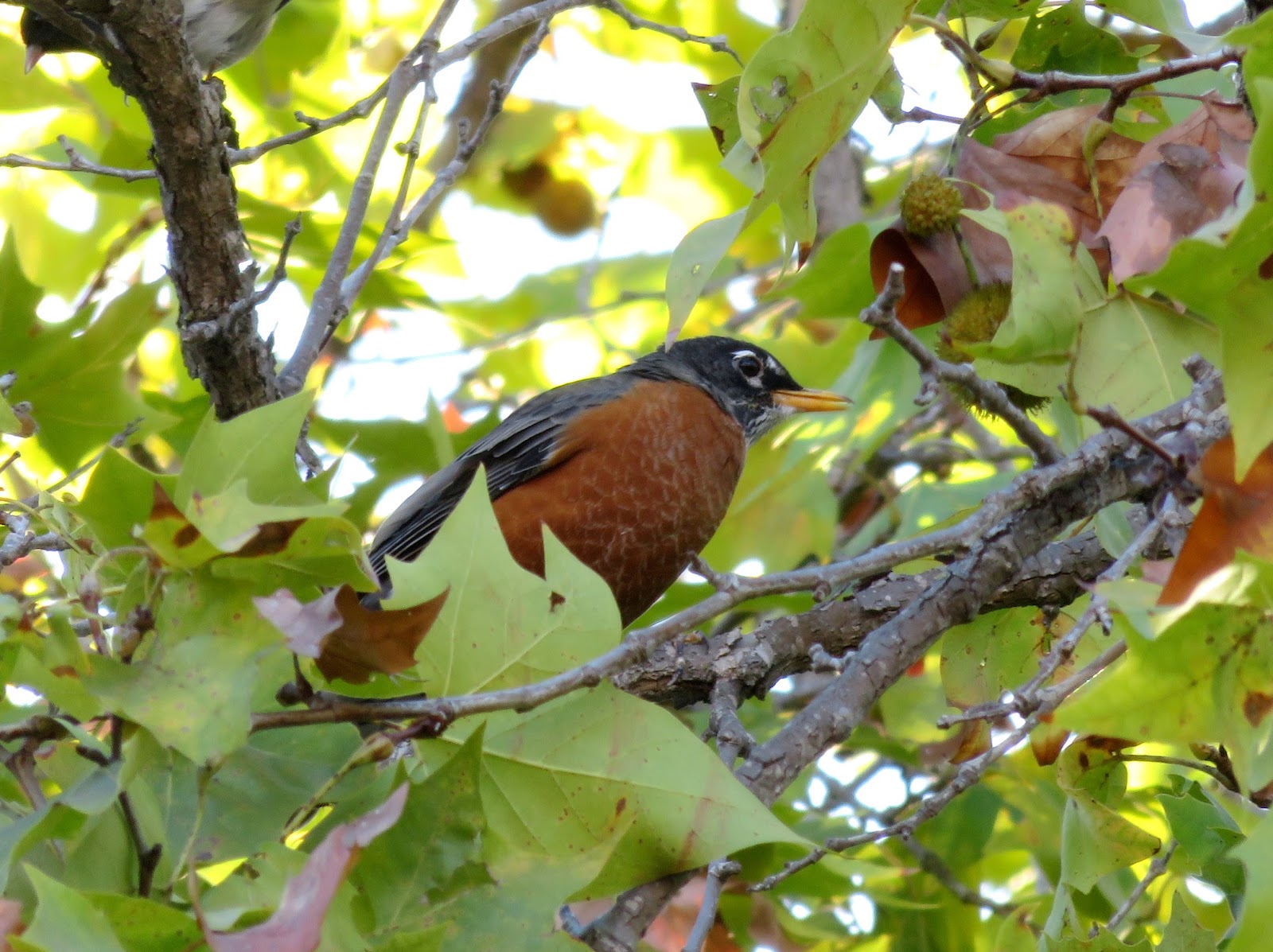 Soon after I saw the kingbird, I noticed a group of birds flying in. Some were singing, and I recognized them as American Robins. There were quite a few, but I had a difficult time trying to take picture because it was dark. Then, a beautiful male robin hopped into the tree right above me where the sun was starting to shine through and I managed to get a photo. Below is the robin.