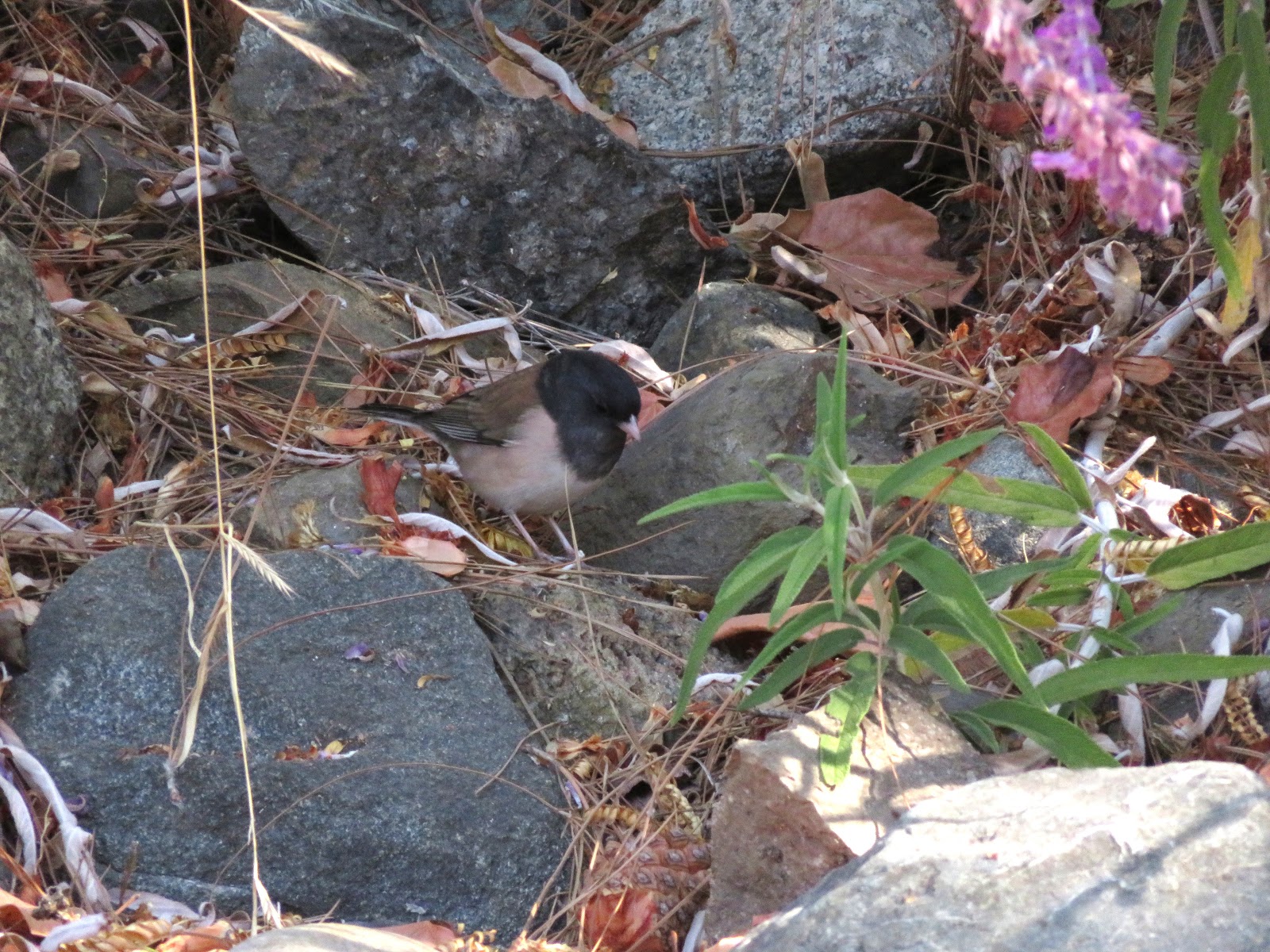 There are also a lot of Dark-eyed Juncos (Oregon subspecies) at Cal Poly. They can be found in the trees, bushes, and on the ground at all times of the day all around campus. Below is a photo of a male junco.