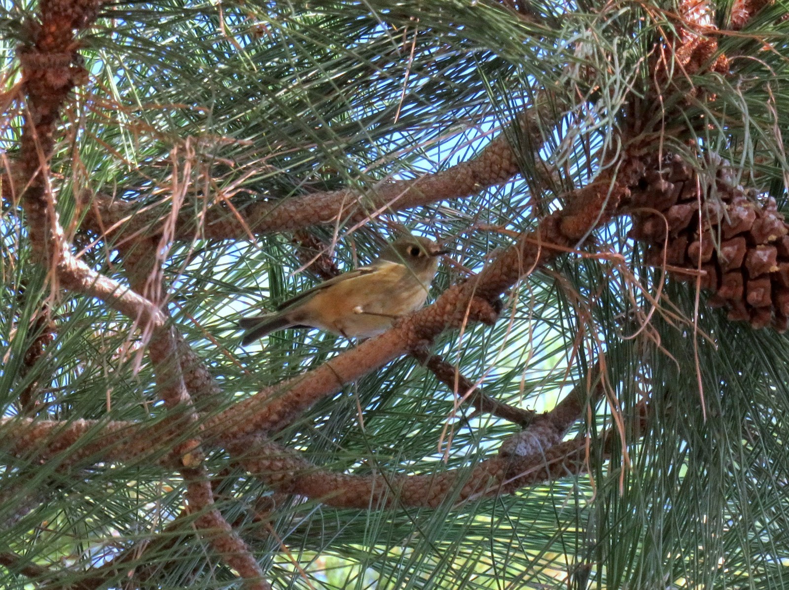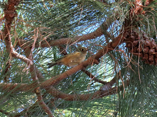 There are a lot of small birds that like to hop around and hide in the dense trees. I usually give up on trying to identify them, but today I had the time to follow one of them and take a few pictures. It turned out to be a little Ruby-crowned Kinglet. Below is a photo of it.