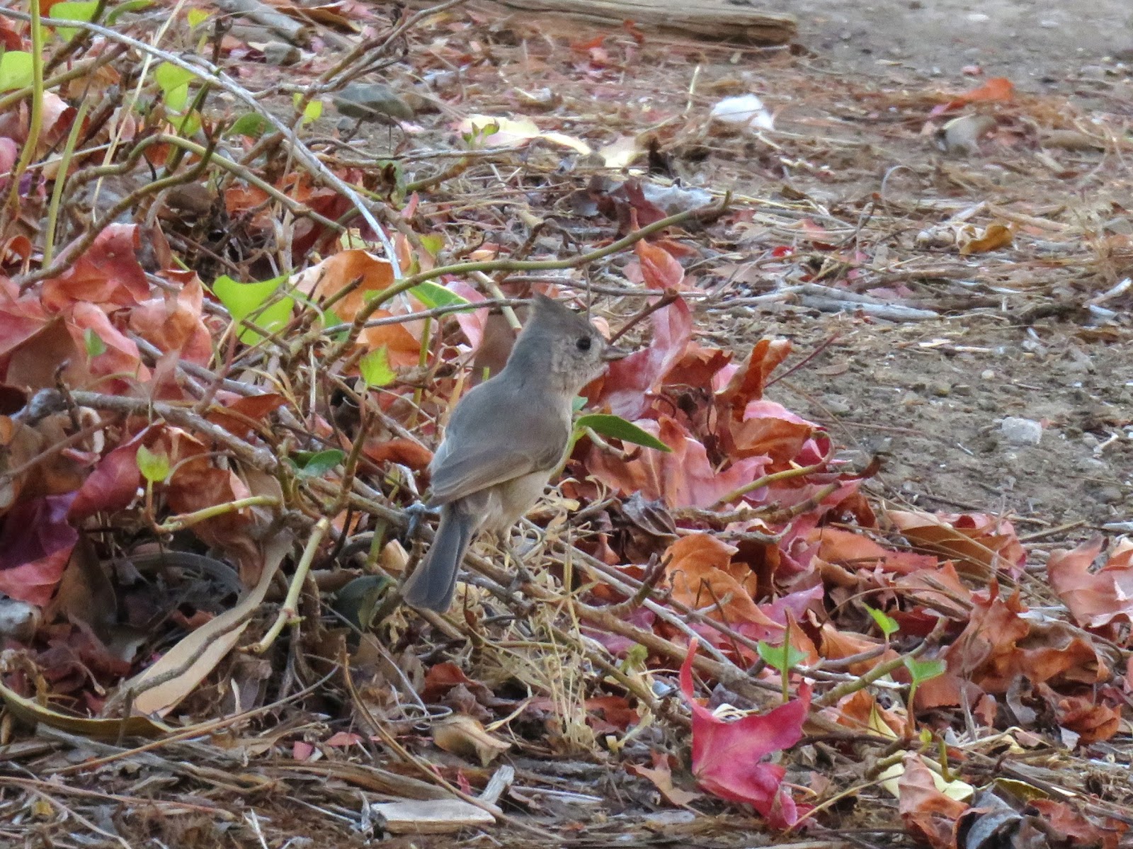 One bird that I didn't expect to see was an Oak Titmouse. They certainly live in this area, but I haven't seen one in a long time (I kind of forgot that they lived here). However, this morning, they were everywhere, and moving very quickly. Oak Titmice are found mainly in the open oak woods of California, but they're also found in part of southern Oregon and northern Baja California. They are very small, plain gray birds with short crests. They are nearly identical to Juniper Titmice, but their ranges only overlap in a small part of northeastern California. They are very cute little birds, and seeing them was probably the highlight of my morning. Below are two photos of one of the Oak Titmice.