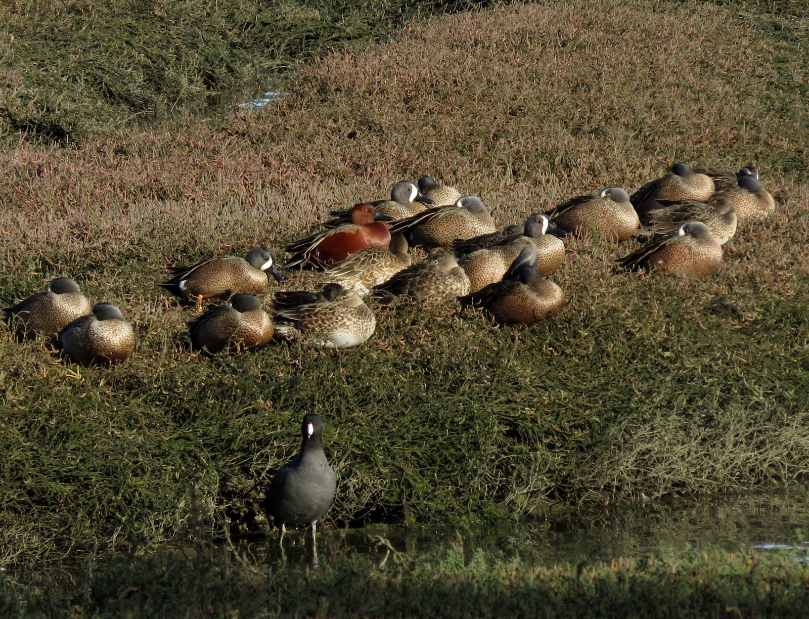 | Blue-winged Teal, Cinnamon Teal, and American Coot |