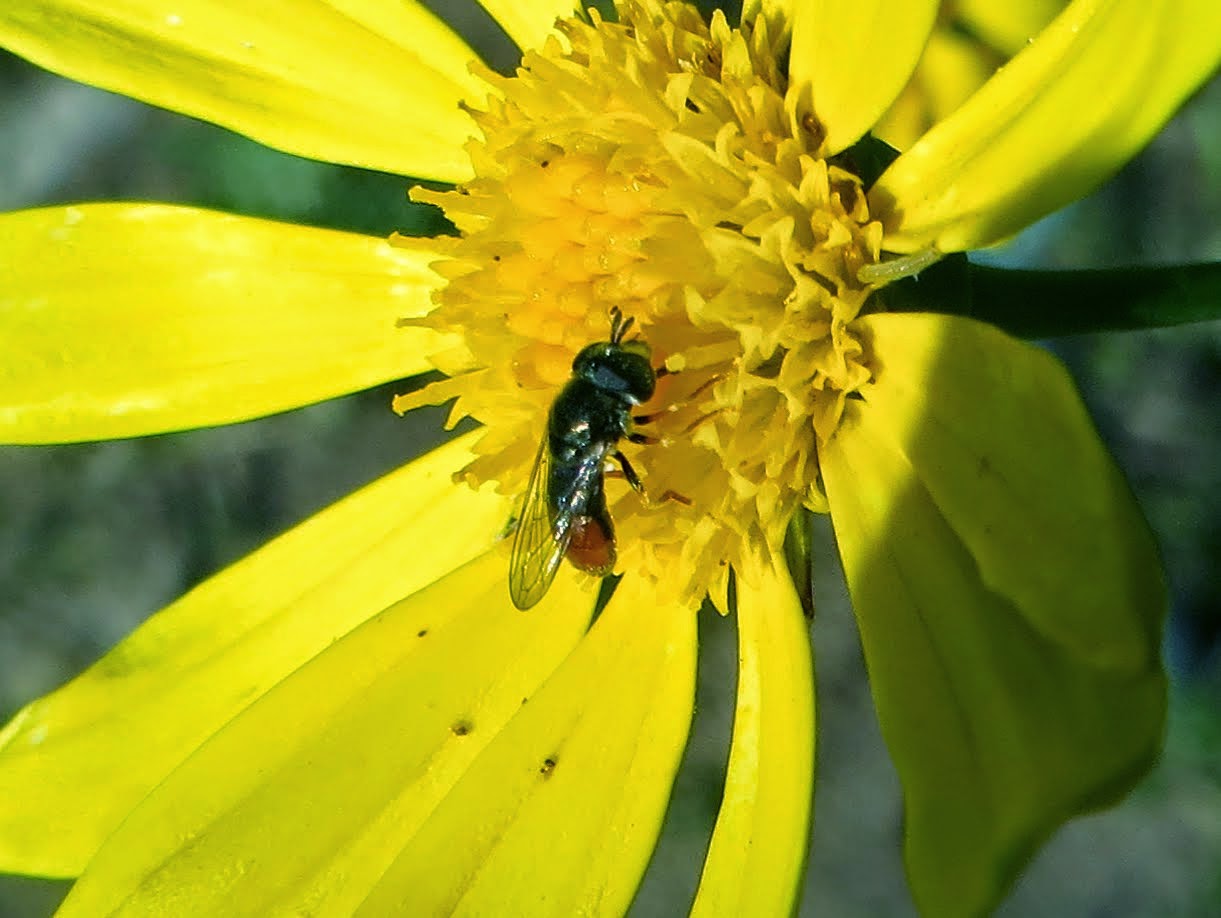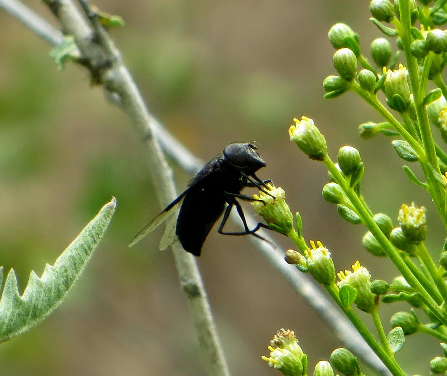 Below is a Mexican Cactus Fly (Copestylum mexicanum). They are shiny bluish-black, large flies; about the size of bumblebees. Larvae feed on rotting cactus while adults feed on flower nectar. At the Buena Vista Lagoon, there are a couple bushes that are covered in these flies at certain times of the year.