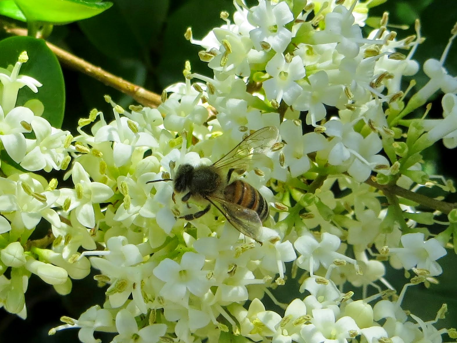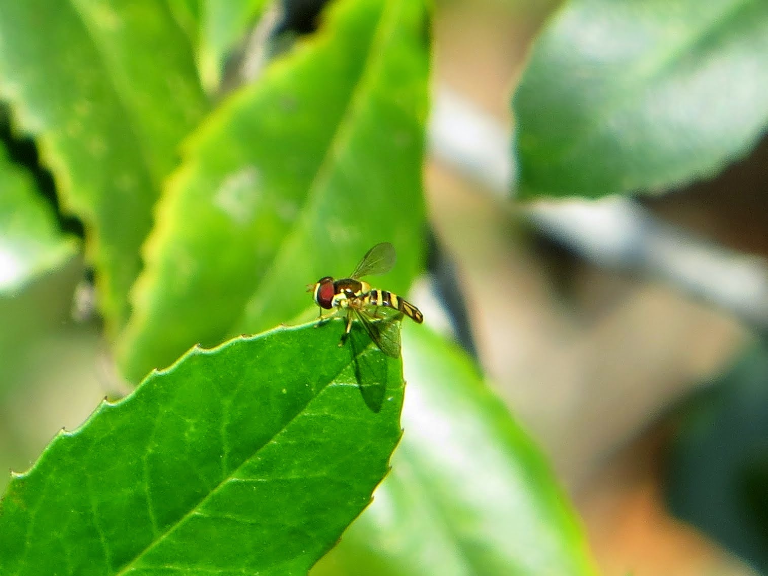 Below is a Hoverfly (Allograpta obliqua). As their name suggests, they hover. They resemble small wasps or bees, but are actually flies. They feed on aphids. They are sometimes called flower flies, since they tend to hang around near flowers, where the aphids are.
