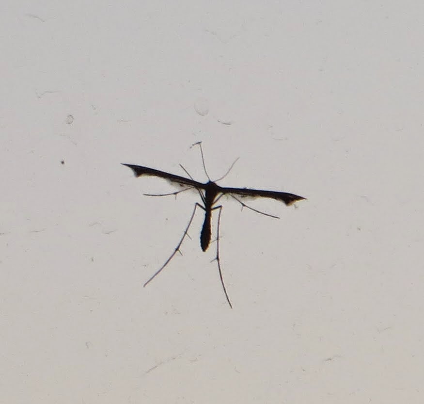 Below is an Artichoke Plume Moth (Platyptilia carduidactyla). They are found throughout the United States, southern Canada, and Mexico. They are slender and hold their wings out, forming a distinctive "T" shape. Their caterpillars feed on artichokes and thistles.