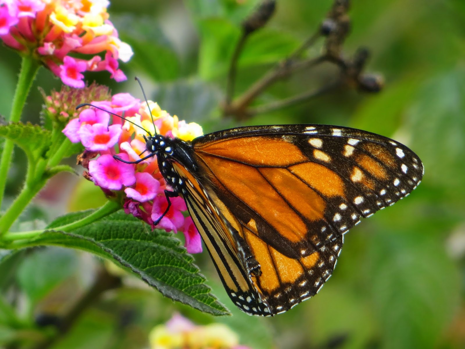 Below is a Monarch (Danaus plexippus). They are large butterflies found in southern Canada and throughout the United States. Their caterpillars feed largely on milkweed plants. There are usually at least a few around my house. There are a lot of them at Cal Poly.