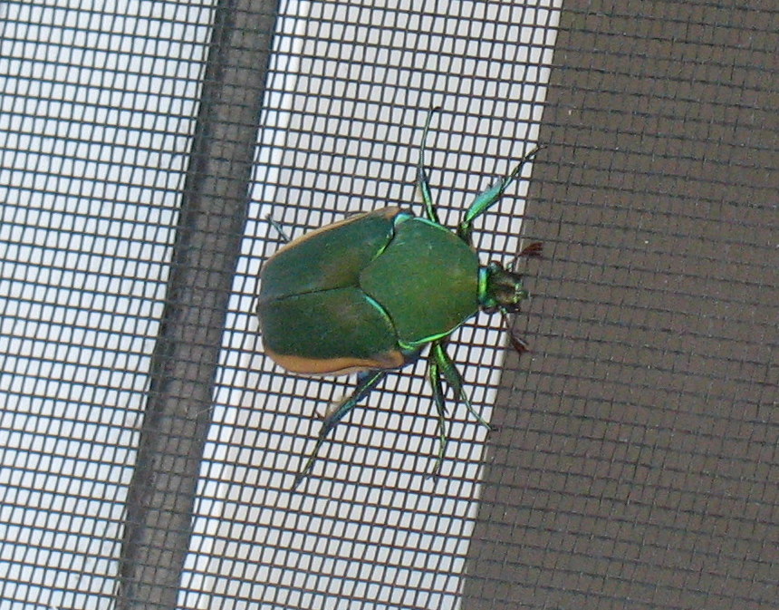 Below is a Green Peach Beetle (Cotinis mutabilis). They are found in central and coastal California, southeastern Arizona, and Mexico. They are members of the scarab family and eat fruit and sap. They are large, very noisy beetles that will often try to fly in your face.