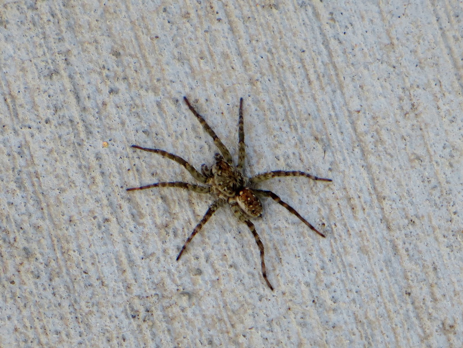 Below is a thin-legged wolf spider (Pardosa sp.). I don't know the exact species (there are about 70, and they all look rather similar). Like most wolf spiders, it was quite large. I found it at high school on the sidewalk. It was lying flat with all of its legs stretched out. Then, suddenly, it raised itself up on its legs, rotated in a circle, looking around, and then ran very quickly to the grass. If you want to look for wolf spiders, try going out at night using a flashlight; their eyes are highly reflective. They're usually very hard to find during the day, as they blend in very well with the ground (unless, of course, they're on a sidewalk).