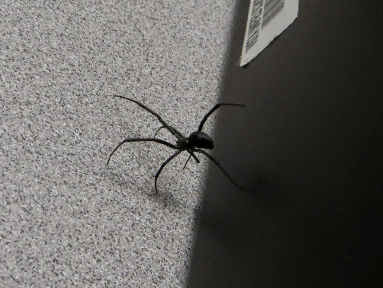 Below is a Southern Black Widow (Latrodectus mactans). Although they are called "southern," they are found throughout North America. Females are almost instantly recognizable by their completely black bodies and red hourglass marks, but males are not so obvious. Males are much smaller and brown, with white lines on their abdomens and a very small red hourglass. Usually, they prefer dark corners, but this one was out in the open in a classroom at high school. It had probably come out at night when the classroom was dark (we found it in the early morning). After it was discovered beside a computer, the teacher safely caught it and released it outside.