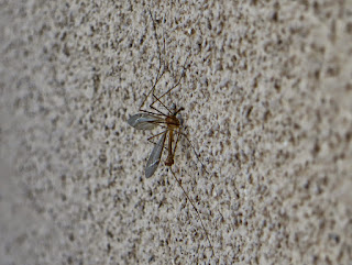 Below are two photos of a Giant Western Crane Fly (Holorusia hespera). They are found along the western coast of the United States from Canada down through California. As their name suggests, they are very large. In fact, they are one of the largest crane fly species in the world with a length (not including legs) of about one and half inches. I've noticed that there are a couple of odd rumors about them, one being that they are giant mosquitoes, and the other being that they eat mosquitoes. Neither is true. While their larvae feed on aquatic plants, adults do not feed (they only live about a day as adults).