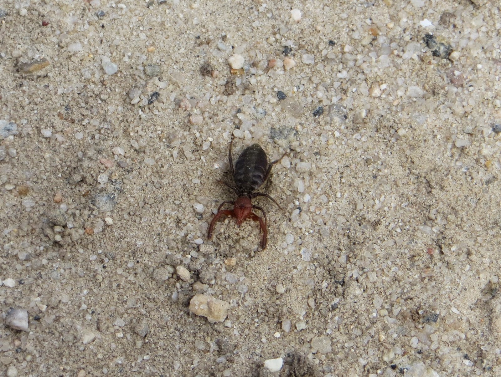 Below is a Wind Scorpion (also called Sun Spider, though they aren't spiders). I don't know the species, since there are over one hundred in the United States. They are very quick and eat insects and spiders. They are usually nocturnal. Although they can bite, they are not poisonous. The one below was digging a hole for some reason; maybe for a burrow. It would dig and dig with its front legs, then gather up the loose dirt and push it away from the hole. It seemed very busy and determined.