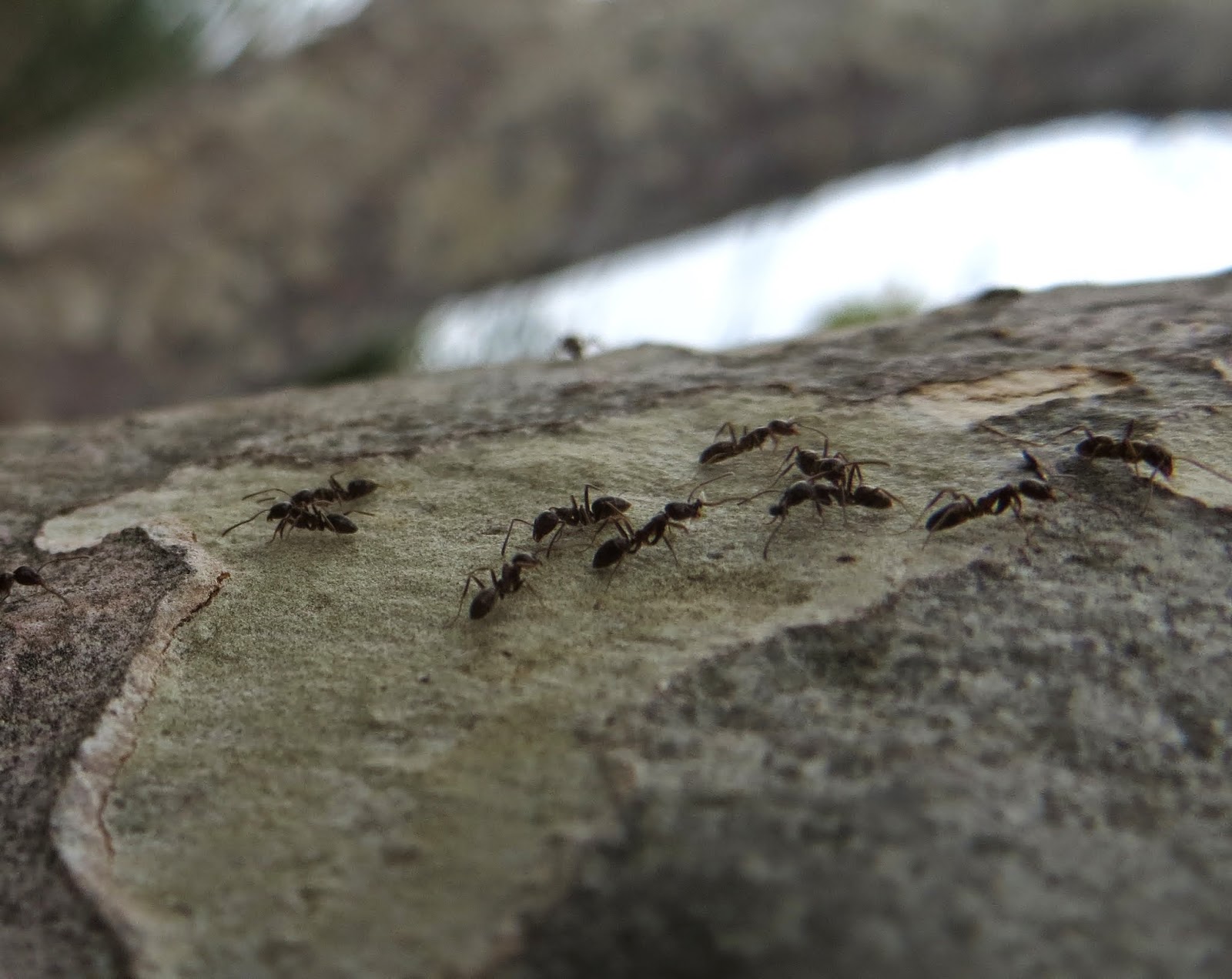 Below are Argentine ants (Linepithema humile). As their name suggests, Argentine ants are native to South America. They were accidentally imported to the United States and are found throughout the southern United States around urban areas. Unlike many other ants, Argentine ant colonies do not fight with each other, and will actually mix and combine to form supercolonies with multiple queens and nests. They are very aggressive toward other species and have few predators. They also farm aphids for their honeydew.