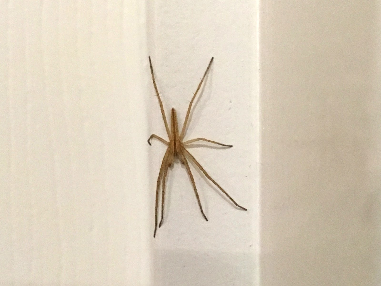 Below is a Slender Crab Spider (Tibellus sp.). Unlike the spider above, Slender Crab Spiders aren't so crab-shaped. They are somewhat large and have long, skinny legs and skinny, triangle-shaped bodies. They can be found on the ground, where they actively pursue prey (they don't build webs). They can remain very still for long periods of time, though, so they might be hard to spot. I usually see them on the walls in my house. I've never actually seen one move.