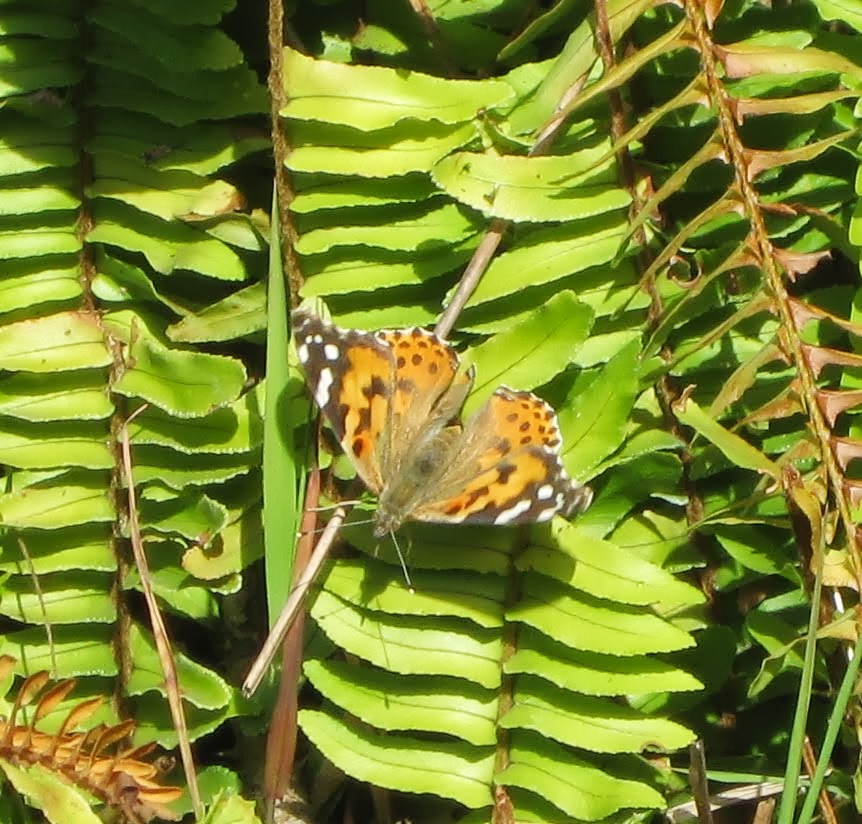 Below is a Painted Lady (Vanessa cardui). They are found throughout North America. They are somewhat faded, but pretty, butterflies. They are very similar to Western Ladies, but their markings are less vivid.