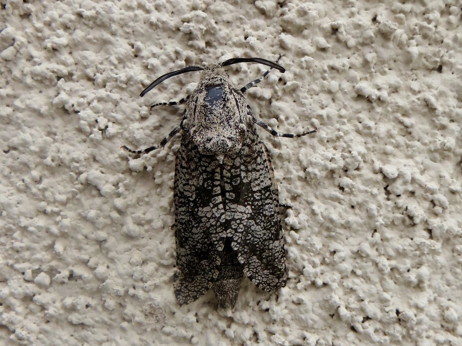 Below is a Carpenterworm Moth (Prionoxystus robiniae). They are large moths with wingspans of up to three inches. They are often found near hardwoods; their caterpillars bore into oaks, ashes, elms, and poplars. They are found in southern Canada and throughout the United States. When their wings are folded (such as in the photo below), their markings resemble a face.