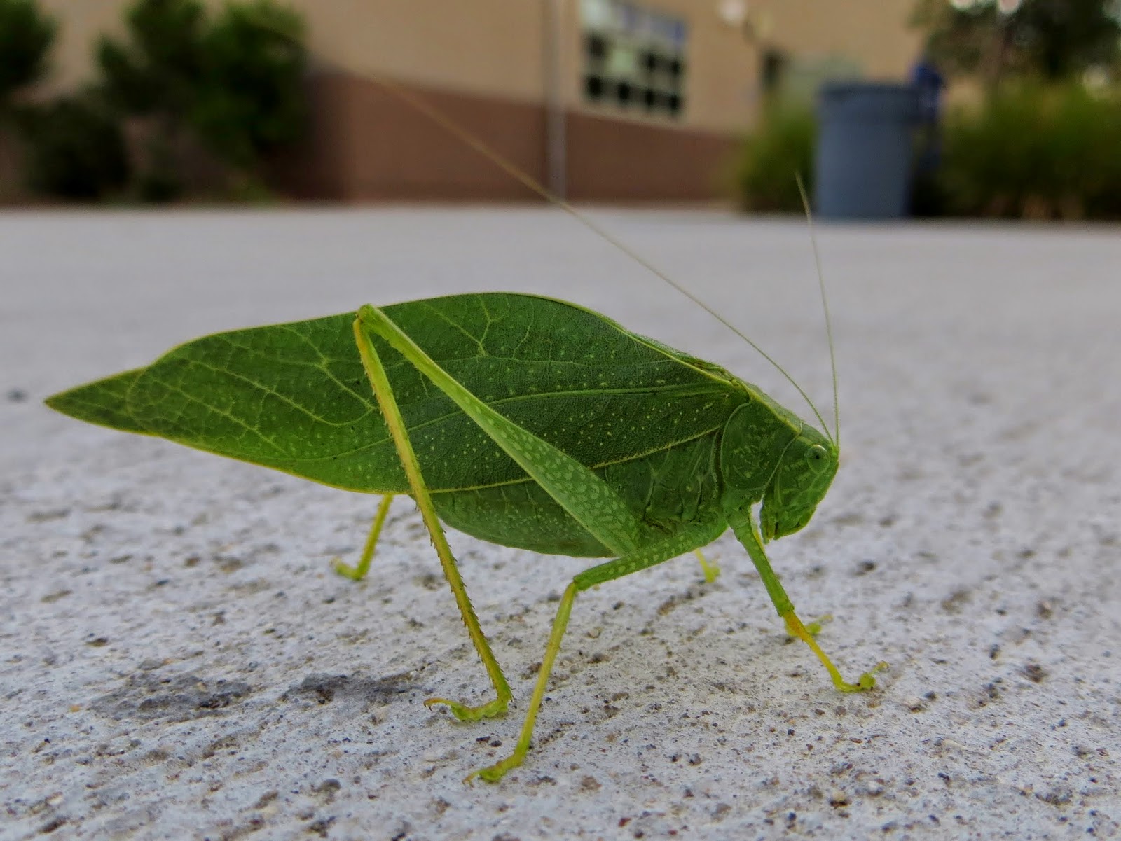 Below is a Broad-winged Katydid (Microcentrum rhombifolium). Broad-winged katydids are somewhat large and resemble leaves. They can be found in woods, parks, and neighborhoods in the southwestern and eastern United States. The one below was in the middle of the concrete at my school and refused to move out of the way, even when someone nudged it. I had to pick it up on my notebook and carry it to the bushes.